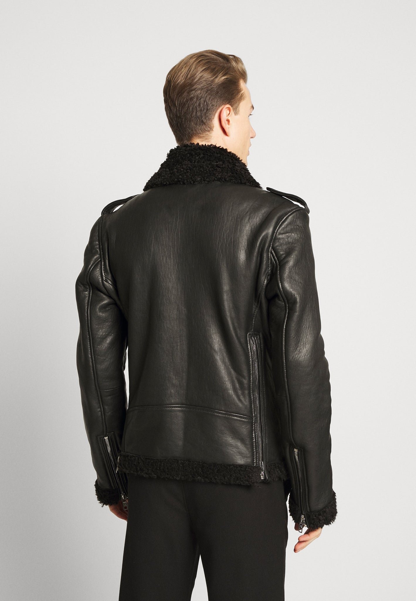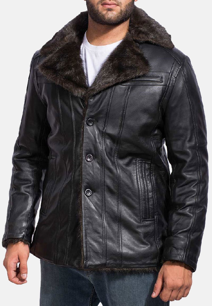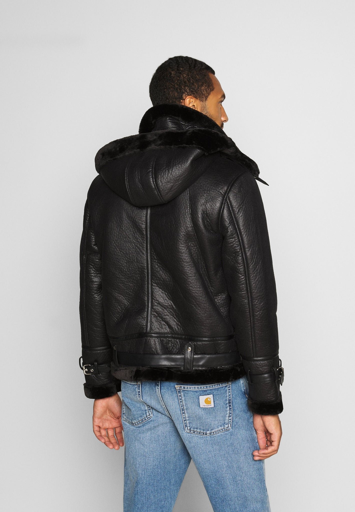 Men’s Aviator Removable Hood Black Leather Shearling Jacket