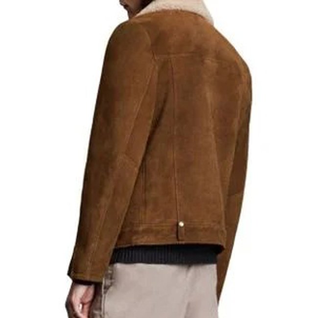 Men's Brown Zipped Leather Shearling Trim Jacket