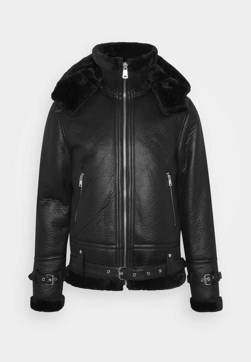 Be the first to review “Men’s Aviator Removable Hood Black Leather Shearling Jacket”