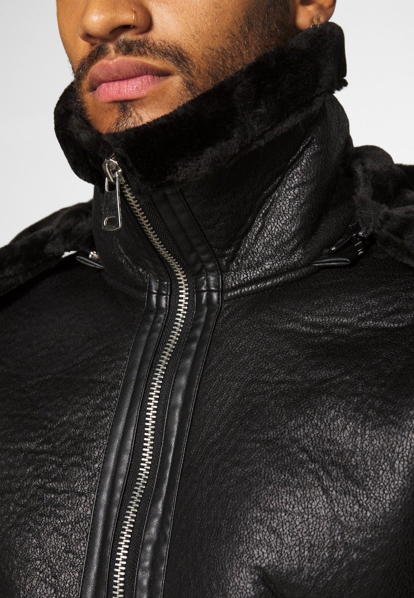 Men’s Aviator Removable Hood Black Leather Shearling Jacket