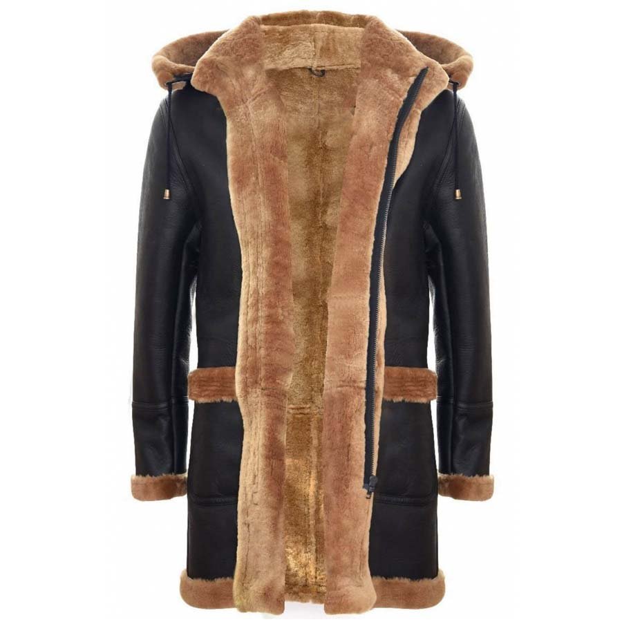 Mens Brown Leather Look Hooded Shearling Sheepskin Coat