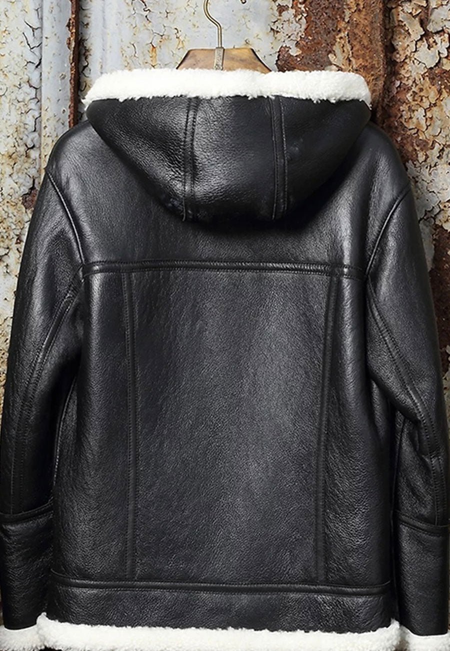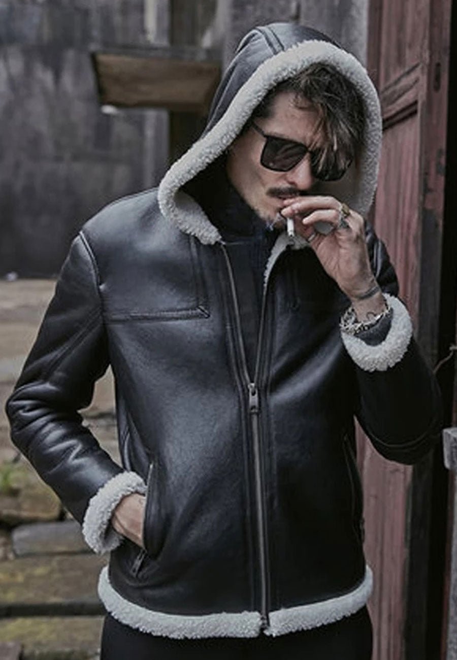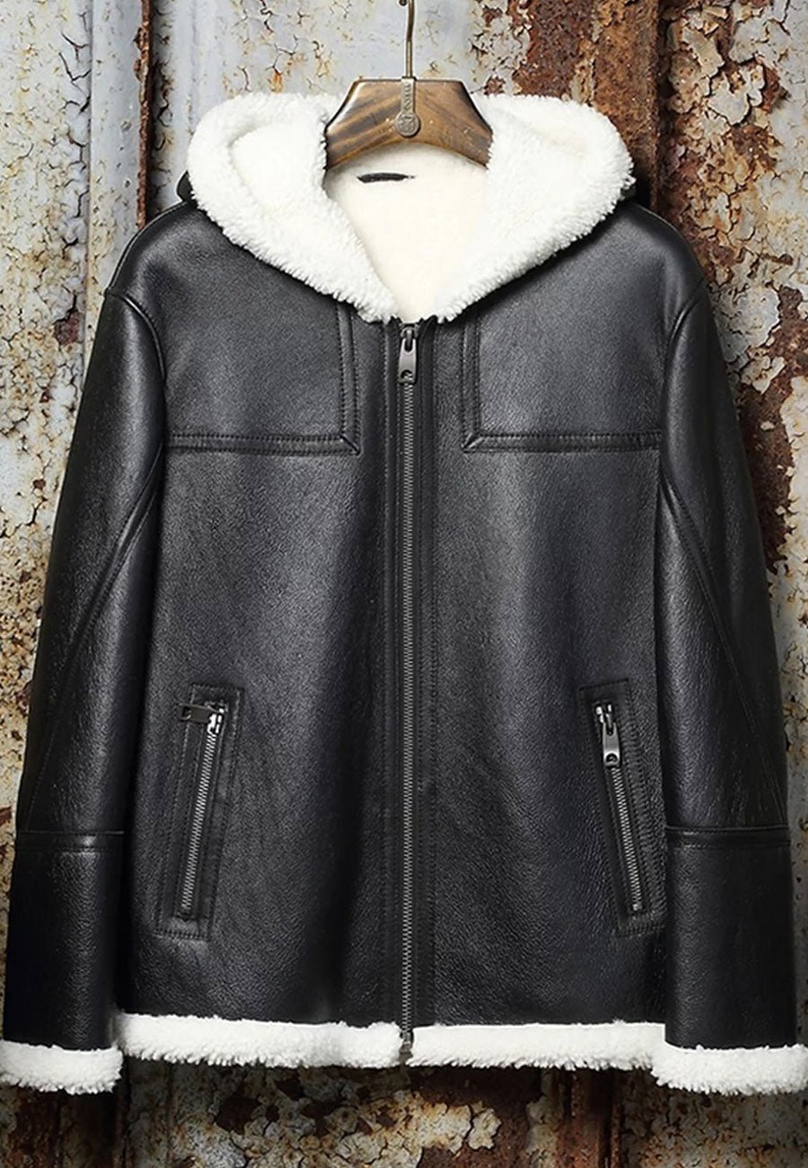 Men’s Black Leather White Shearling Hooded Jacket